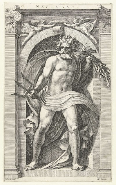 No. 79 in Groot Teekenboek. Neptunus met drietand, heerser over de zee, wordt hier door dolfijnen voortgetrokken. De dolfijnen die de nereïde Amphritite achtervolgden toen zij gevlucht was voor Neptunus’ toenaderingen, hebben haar overreden om terug te komen en zijn bruid te worden. Hier rijdt zij naast Neptunus op de rug van een dolfijn. Neptunus en Amphritite worden omringd door zeenimfen en tritons. Boven hen zweven putti.