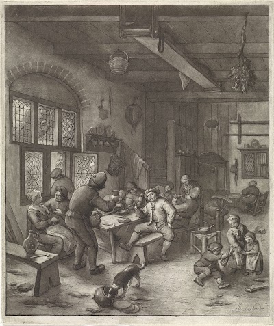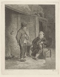 Een vader geeft een klein kind op zijn schoot te eten. De moeder staat bij de haard waar een pot boven het vuur hangt. Een klein kind zit op de grond bij een kruk te eten. Dit boerengezin is gesitueerd in een armoedig interieur met verschillende huishoudelijke attributen en op de achtergrond een bedstee. De prent maakt deel uit van een portefeuille en is met een andere prent op één albumblad gedrukt.
