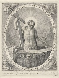 Johannes de Doper, staande in een rotslandschap bij een waterval. Hij wijst met zijn rechterhand naar boven, in de linkerhand houdt hij een staf met een banderol.