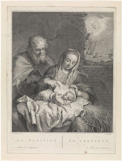 Maria en Jozef tonen, gezeten in/bij een ruïne, hun pasgeboren kind aan twee herders. Op de achtergrond de verkondiging aan de herders door een engel. Onder de voorstelling vier Latijnse versregels. Deze prent is onderdeel van een serie van zes prenten met scènes uit het vroege leven van Maria. Die worden de 'Meesterstukken' genoemd, omdat Goltzius er het werk van verschillende illustere voorgangers in heeft nagebootst.