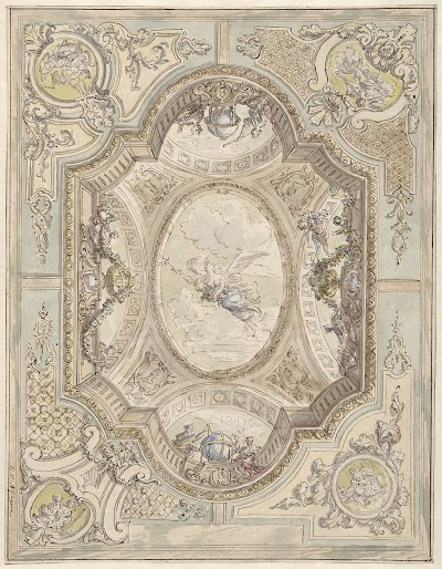 Ontwerp voor een hoekstuk van een plafond met zittende figuren, putti en buste van een sater, Mattheus Terwesten, after Augustinus Terwesten (I), 1680 - 1757