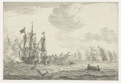 Zeeslag tussen Nederlandse en Engelse schepen. In het midden een zinkend schip, twee reddingssloepen met mensen, mast van een tweede gezonken schip nog zichtbaar.
