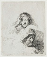 In 1634 Rembrandt married Saskia Uylenburgh, the daughter of a mayor of Leeuwarden. Almost all of the heads in these studies are of her. Rembrandt evidently thoroughly enjoyed portraying his new bride in ever-different poses. The fluid lines suggest that he drew directly on the etching ground, at times without his models being aware of it.