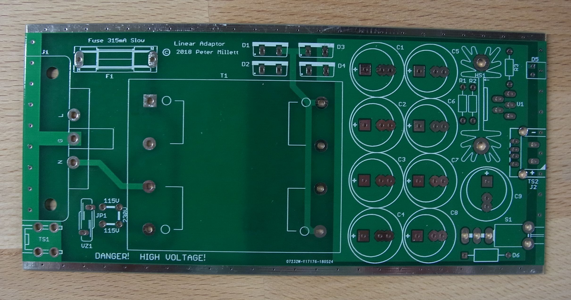Just the basics: IEC connector, varistor, fuse, transformer, bridge rectifier, filter caps, and a linear regulator (LM2941). It slides into a Hammond 1455K1601 case.