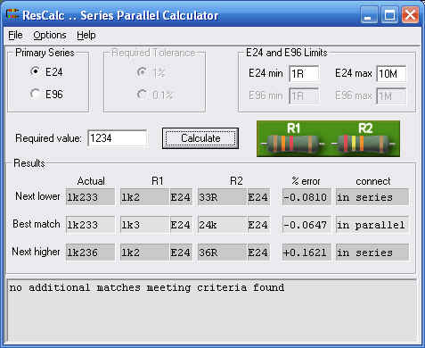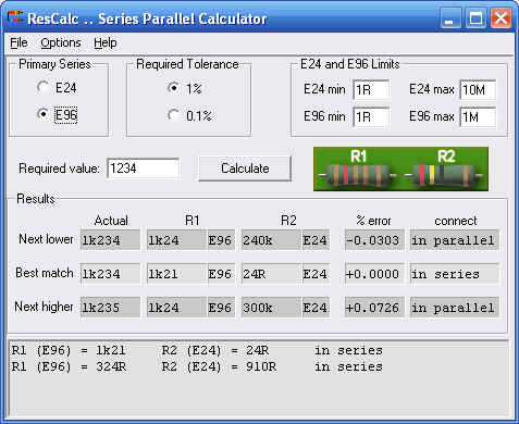 This example shows the same desired value (1.234k) using E96-series resistors. E96 values are what we normally have available (at least in the US) as 1% standard value resistors.